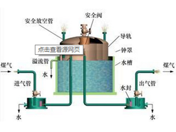 恒壓濕式氣柜主要是由立式圓筒形的水槽、由一個圓形鐘罩以及導(dǎo)向裝置組成。