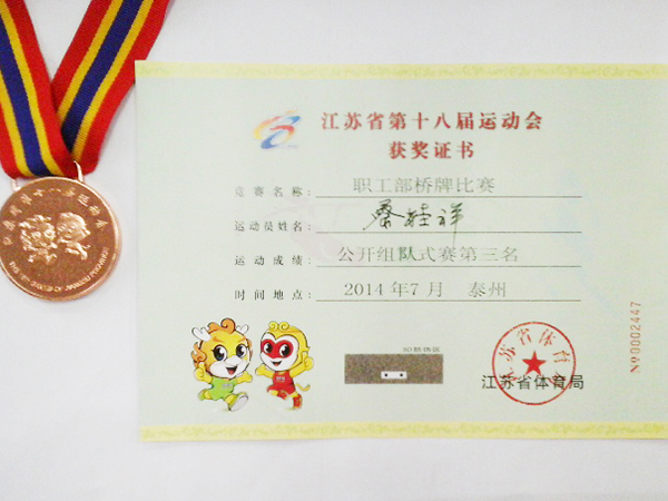 7月20-26日,江蘇省第十八屆運動會職工部橋牌比賽在泰州市舉行,應(yīng)蘇州市總工會邀請,我公司職工蔡桂祥代表蘇州市參賽。經(jīng)過激烈角逐,蘇州代表隊獲得了團體第三名的好成績,蔡桂祥個…