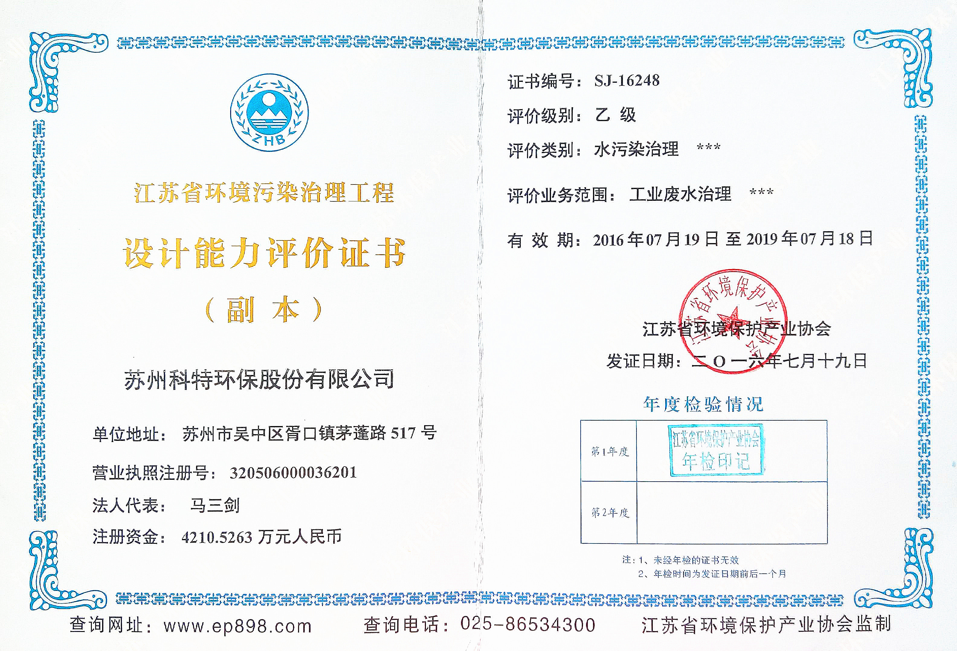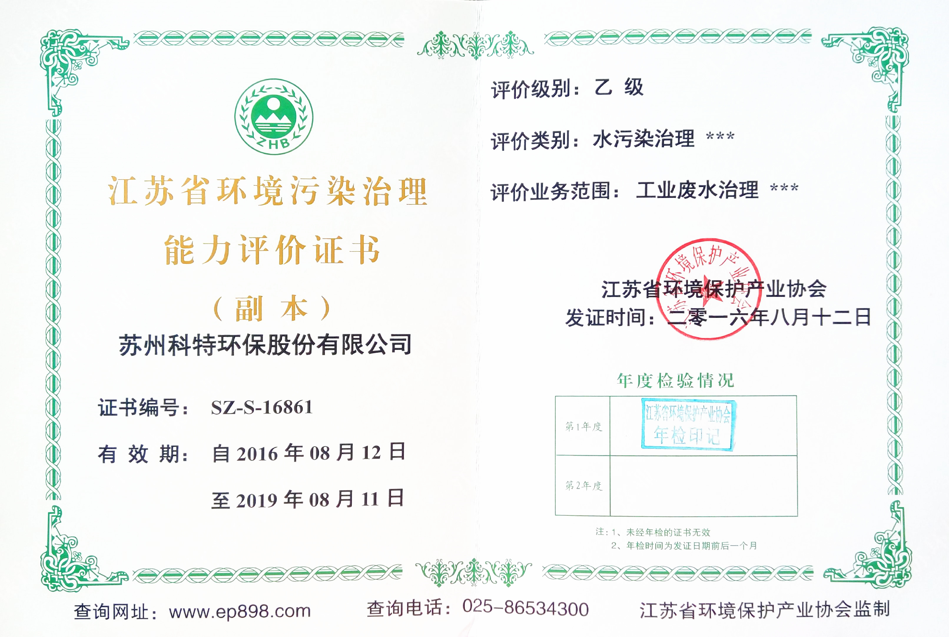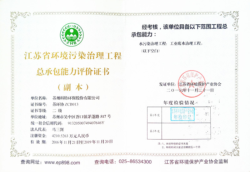 6月5日,科特環(huán)保向江蘇省環(huán)境保護(hù)產(chǎn)業(yè)協(xié)會(huì)提交了“江蘇省環(huán)境污染治理工程設(shè)計(jì)能力評(píng)價(jià)”、“江蘇省環(huán)境污染治理工程總承包能力評(píng)價(jià)”及“江蘇省環(huán)境污染治理能力評(píng)價(jià)”三項(xiàng)資質(zhì)證書(shū)的年檢資料,經(jīng)過(guò)省環(huán)境保護(hù)產(chǎn)業(yè)協(xié)會(huì)審查,科特各項(xiàng)條件均符合能力評(píng)價(jià)要求,以上3項(xiàng)資質(zhì)均順利通過(guò)年檢。近日,已收到蓋有省環(huán)境保護(hù)產(chǎn)業(yè)協(xié)會(huì)年檢印記的證書(shū)。年檢的順利通過(guò),是對(duì)科特在環(huán)境污染治理---工業(yè)廢水治理領(lǐng)域所擁有的總承包能力、工程設(shè)計(jì)能力及治理能力的綜合肯定;同時(shí),也為科特環(huán)保在未來(lái)市場(chǎng)準(zhǔn)入及開(kāi)拓提供有強(qiáng)有力的支撐。公司將再接再厲,加強(qiáng)人才梯隊(duì)建設(shè),提升工程設(shè)計(jì)水平、治理水平及總承包能力,再創(chuàng)佳績(jī)!